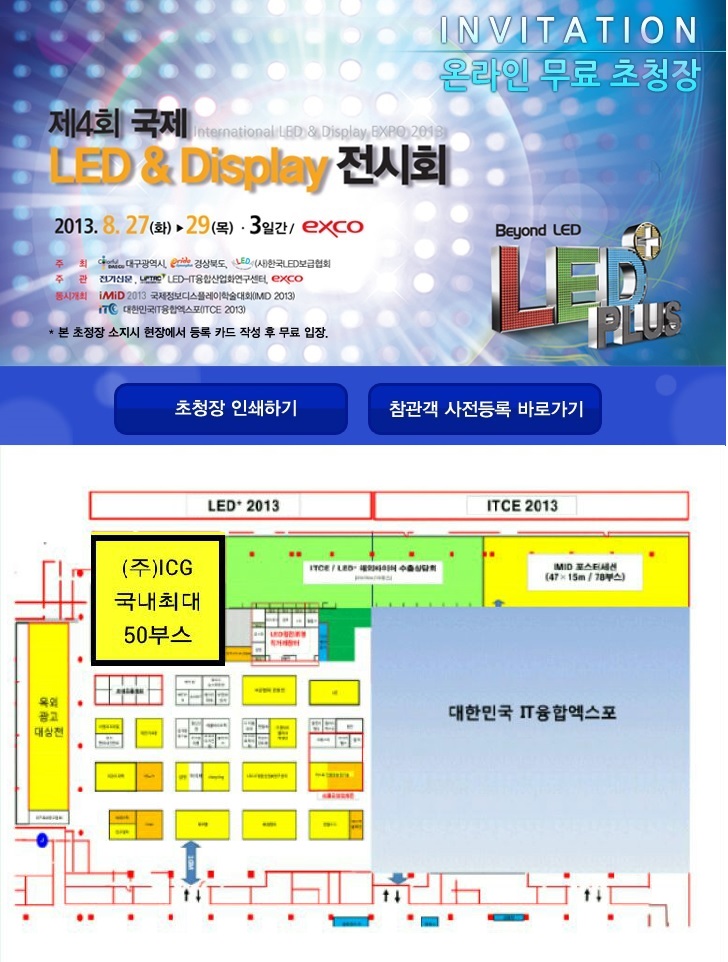 ÇÏÀÌÅÍÄ¡ Á¦4ȸ ±¹Á¦ LED & µð½ºÇ÷¹ÀÌ Àü½Ãȸ 8¿ù 27~29ÀÏ Àå¼Ò : ´ë±¸ EXCO ¹«·áÀÔÀå ¿¡½ºÄÚÆ® : 010-7938-4040 (ÁÖ)ICG ( www.trinled.com ) ¿¡¼´Â Á¦31ȸ - ±¹Á¦ LED EXPO_ LED Àü±¤ÆÇ ½ºÅ©¸° 3D LED, LED ART, LEDÀü±¤ÆÇ Ưº°ÀüÀ» ±¹³»ÃÖ´ë 50ºÎ½ºÀÇ ³ÐÀº LED Àü±¤ÆÇ ½ºÅ©¸° Ưº°°ü¿¡¼ ½Ç½ÃÇÕ´Ï´Ù. Âü¼® ¾È³» ¹× Á¦ÀÛ ÆÇ¸Å ·»Å» Ãë±ÞÁ¡ ´ë¸®Á¡ ¸ðÁý ¼³¸íȸ¿¡ Âü¼®À» ¿øÇϴ ȸ»ç¿Í °³ÀÎÀº 010-7938-4040 ·Î ÀüÈ Áֽøé ÀÚ¼¼ÇÑ ¾È³»¸¦ ¹ÞÀ» ¼ö ÀÖ½À´Ï´Ù. (ÁÖ)I.C.G.(www.trinled.com)´Â Tel. 02-1600-9906